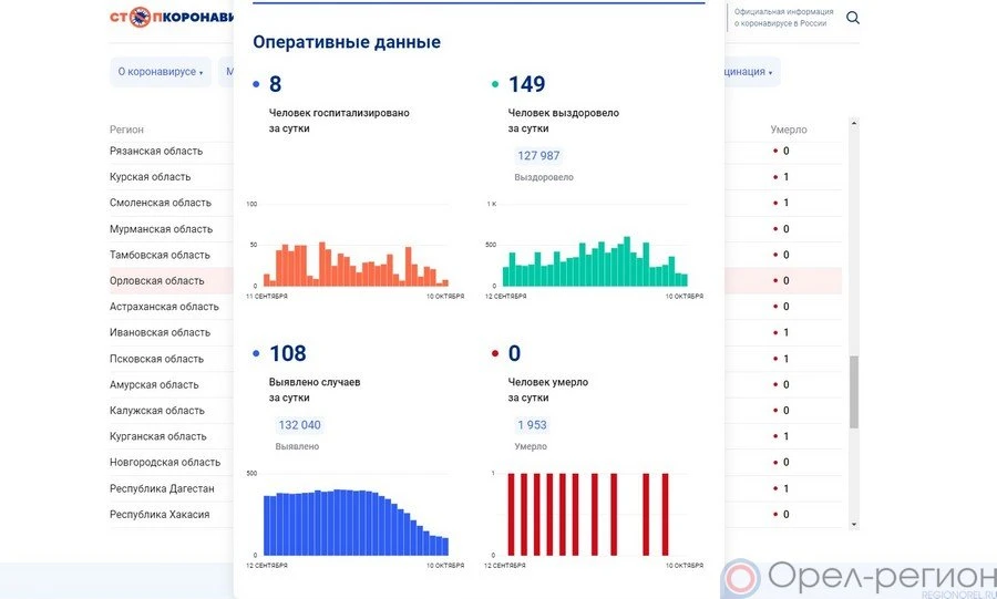 В России за сутки уменьшилось число подтверждённых новых случаев заболевания COVID-19. Так, 9 октября было 18 819 человек, 10 октября зарегистрировано 15 661 (-3158 за сутки).