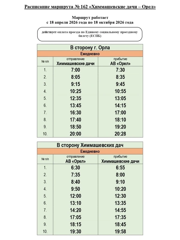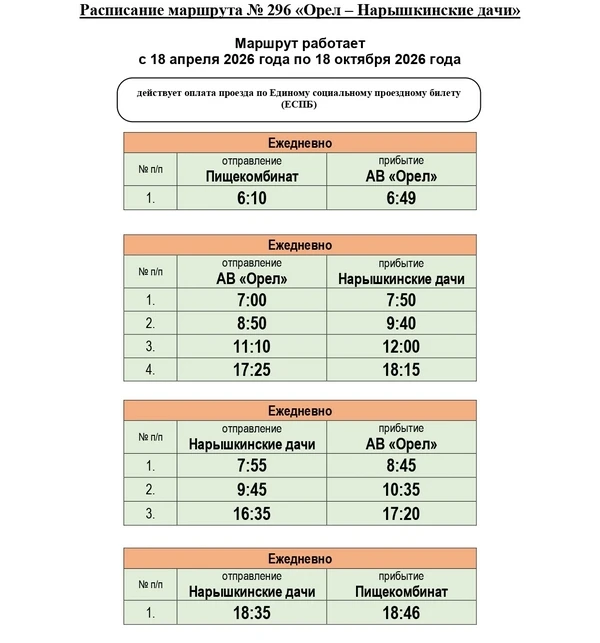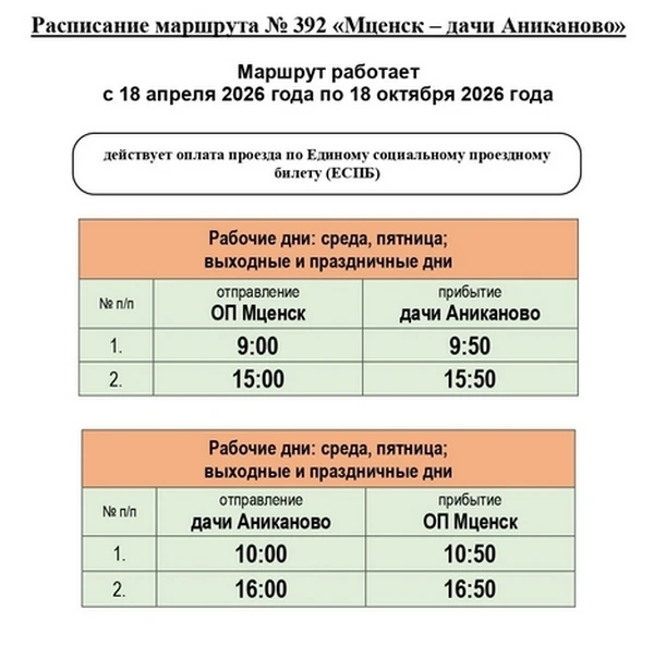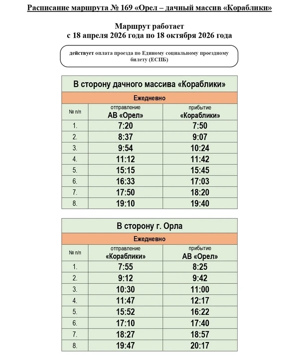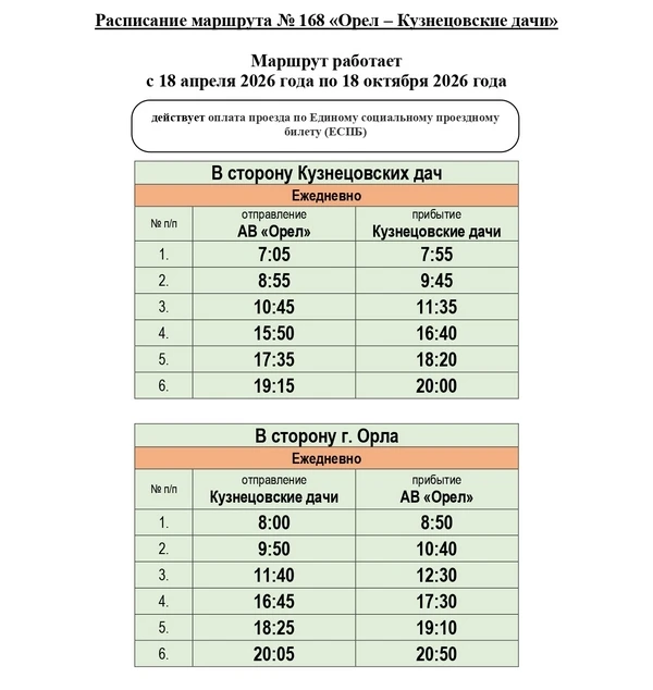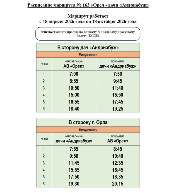 В 2026 году на территории региона 9 дачных маршрутов будут организованы КУ ОО «Организатор перевозок», 3 — администрацией города Орла, 1 — администрацией города Ливны. Кроме того, КУ ОО «Организатор перевозок» обеспечивается подвоз граждан к садово-дачным массивам по 18 круглогодичным межмуниципальным маршрутам пригородного сообщения.