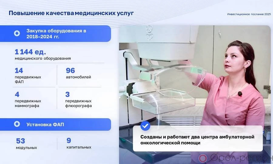 В ООКБ за последние годы освоено более десяти новых видов оперативных вмешательств, сотрудники Орловского онкодиспансера освоили и внедрили в повседневную практику весь спектр операций. В Орле медицинская помощь оказывается на уровне, сравнимом с центральными федеральными клиниками. В регионе идёт работа по возведению ФАПов и ремонту поликлиник.