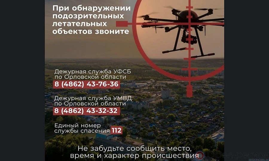 «Прошу всех жителей региона при обнаружении в небе подобных объектов сохранять спокойствие и в любое время суток незамедлительно сообщить по телефонам: дежурной службы УФСБ по Орловской области 8 (4862) 43-76-36, дежурной части УМВД России по Орловской области 8 (4862) 43-32-32, либо на единый номер службы спасения - 112, сообщив место, время и характер наблюдаемого происшествия. Это поможет оперативно определить и нейтрализовать угрозу, избежав серьезных последствий.
