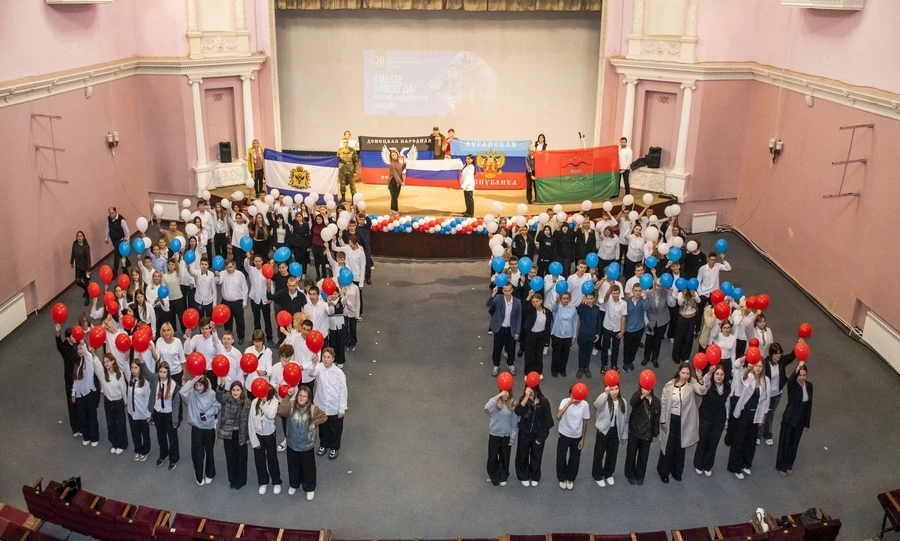В завершение мероприятия ребята выстроились в цифру 89 — по количеству субъектов нашей страны. В руках они держали бело-сине-красные шары, а на сцене были развёрнуты флаги четырёх новых регионов и российский триколор.