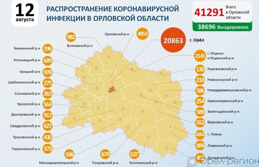 Также добавим, что, по данным федерального оперативного штаба на 12 августа, с начала пандемии в Орловской области выявлены 41 291 человек, инфицированных коронавирусом (+108 - за минувшие сутки). Выздоровели 38 696 человек (+61 за сутки), умерли 891 (4 за сутки).