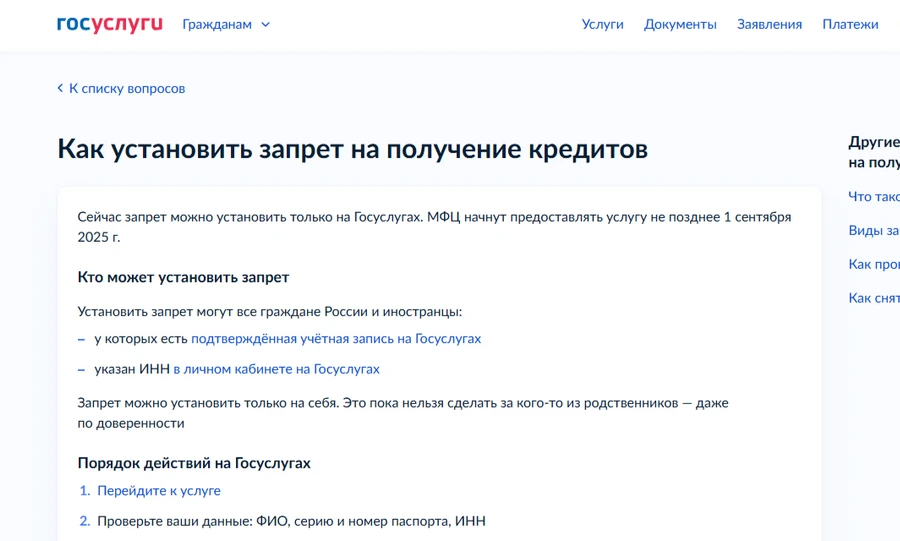 Возможность устанавливать самозапреты на кредиты и займы появилась с 1 марта этого года. Она даёт возможность человеку запретить банкам и микрофинансовым организациям выдавать кредиты и займы на его имя.