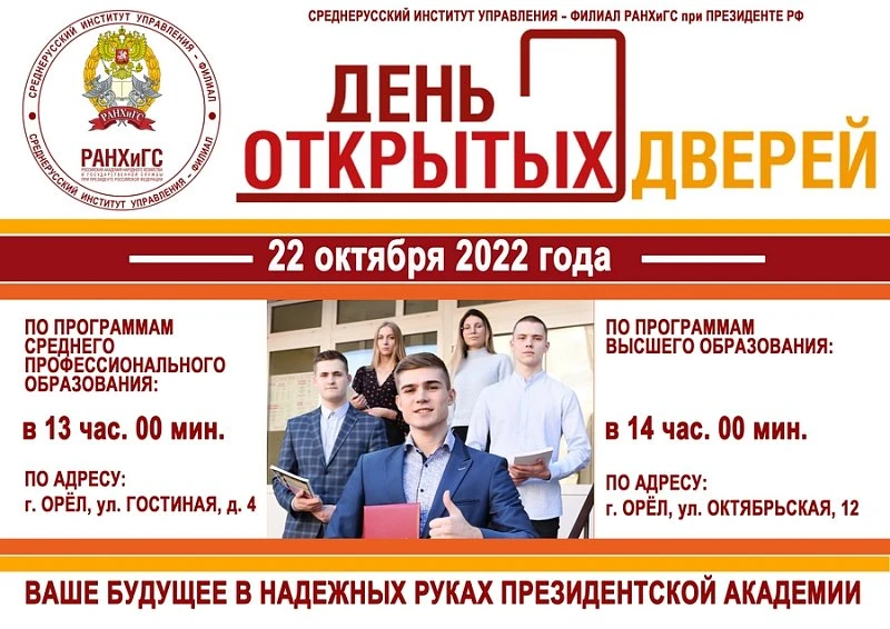 - по программам высшего образования в 14.00 по адресу: г. Орел, ул. Октябрьская, д. 12 (Среднерусский институт управления - филиал РАНХиГС).