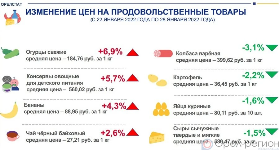 По их сведениям, за неделю с 21 по 28 января в регионе, в частности, подорожали такие продукты как огурцы свежие - на 6,9%, консервы овощные для детского питания - на 5,7%, бананы - на 4,3%.