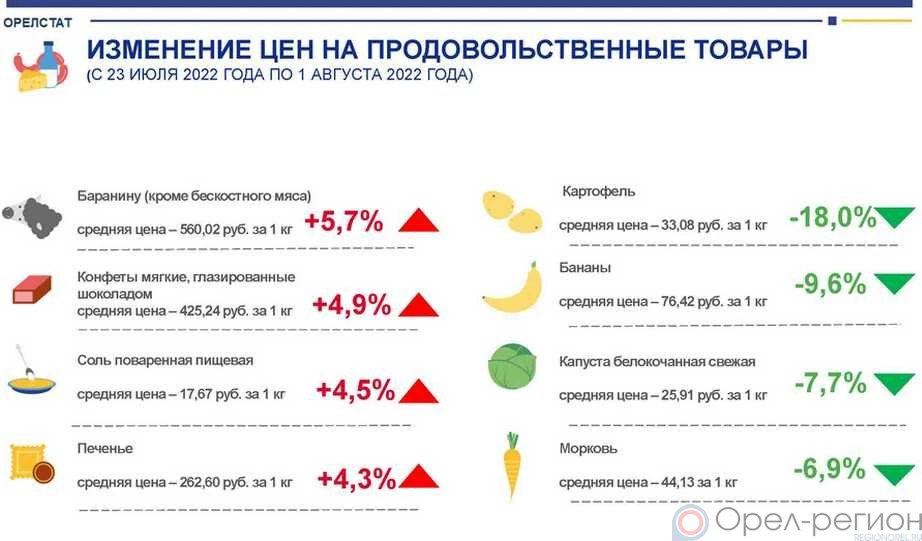 По их сведениям за неделю с 23 июля по 1 августа в регионе, в частности, подорожали баранина (кроме бескостного мяса) - на 5,7%, конфеты мягкие, глазированные шоколадом - на 4,9%, соль поваренная пищевая - на 4,5%.