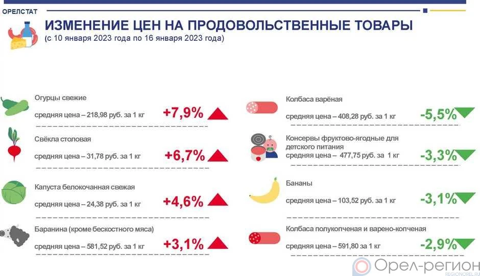 По их сведениям, за неделю с 10 по 16 января в регионе, в частности, подорожали огурцы свежие - на 7,9%, свёкла столовая - на 6,7%, капуста белокочанная свежая - на 4,6%.