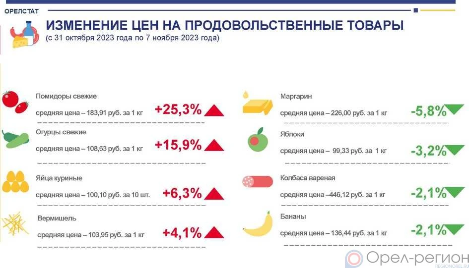 По их сведениям, за неделю с 31 октября по 7 ноября в регионе, в частности, подорожали помидоры свежие - на 25,3%, огурцы свежие - на 15,9%, яйца куриные - на 6,3%