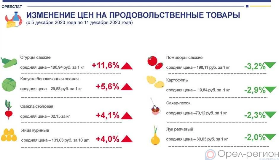 По их сведениям, за неделю с 5 по 11 декабря в регионе, в частности, подорожали огурцы свежие - на 11,9%, капуста белокочанная свежая - на 5,6%, свёкла столовая - на 4,1%.