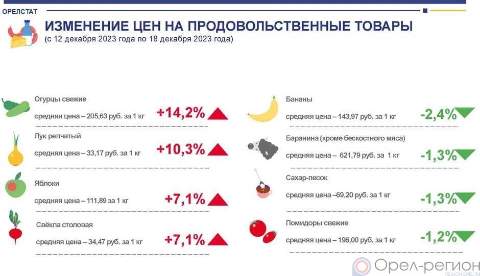 По их сведениям, за неделю с 12 по 18 декабря, в регионе, в частности, подорожали огурцы свежие - на 14,2%, лук репчатый - на 10,3%, яблоки - на 7,1%.