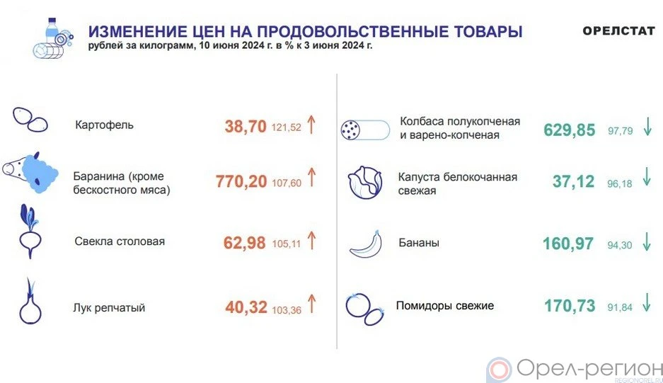 Так, по данным Орёлстата, с 4 по 10 июня в регионе выросли цены на картофель на 21,5% (средняя цена составила 38,70 руб. за кг), баранину (кроме бескостного мяса) на 7,6% (770,20 руб. за кг), свёклу столовую на 5,1% (62,98 руб. за кг), лук репчатый на 3,4% (40,32 руб. за кг).