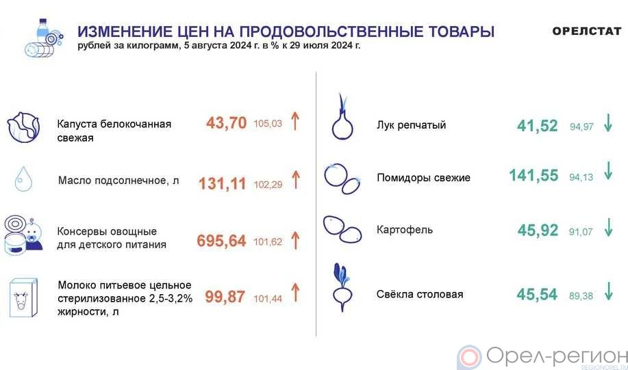 По данным Орёлстата, с 30 июля по 5 августа в регионе выросли цены на капусту белокочанную свежую на 5% (средняя цена составила 43,70 руб. за кг), масло подсолнечное на 2,3% (131,11 руб. за л), консервы овощные для детского питания на 1,6% (695,64 руб. за кг), молоко питьевое цельное стерилизованное 2,5-3,2% жирности на 1,4% (99,87 руб. за л).
