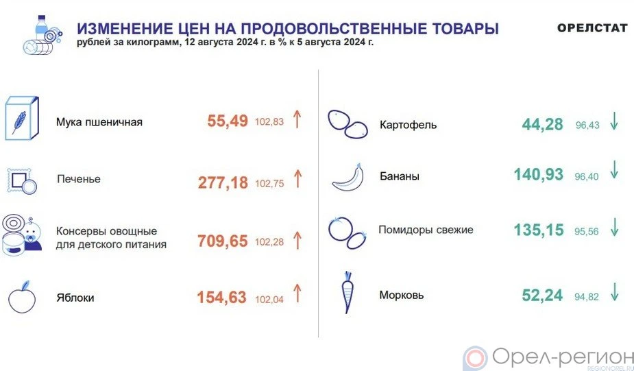 По данным Орёлстата, с 6 по 12 августа в регионе выросли цены на цены на муку пшеничную на 2,8% (средняя цена составила 55,49 руб. за кг), печенье на 2,8% (277,18 руб. за кг), консервы овощные для детского питания на 2,3% (709,65 руб. за кг), яблоки на 2% (154,63 руб. за кг).