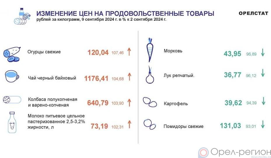По данным Орёлстата, с 3 по 9 сентября в регионе выросли цены на огурцы свежие на 7,5% (средняя цена составила 120,04 руб. за кг), чай чёрный байховый на 4,7% (1176,41 руб. за кг), колбасу полукопчёную и варёно-копчёную на 3,9% (640,79 руб. за кг), молоко питьевое цельное пастеризованное 2,5-3,2% жирности на 2,3% (73,19 руб. за л).