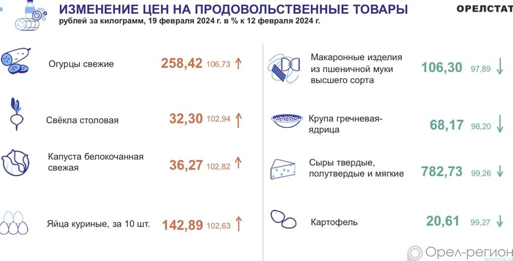 По сведениям ведомства, с 13 по 19 февраля в регионе выросли цены на огурцы свежие на 6,7% (средняя цена составила 258,42 руб. за кг), свёклу столовую на 2,9% (32,30 руб. за кг), капусту белокочанную свежую на 2,8% (36,27 руб. за кг), яйца куриные на 2,6% (142,89 руб. за 10 шт.).