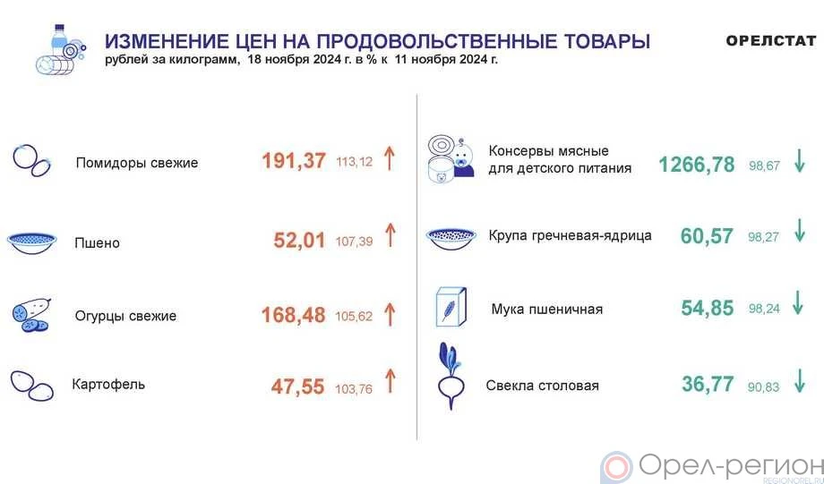 По данным Орёлстата, с 6 по 11 ноября в регионе выросли цены на помидоры свежие на 13,1% (средняя цена составила 191,37 руб. за кг), пшено на 7,4% (52,01 руб. за кг), огурцы свежие на 5,6% (168,48 руб. за кг), картофель на 3,8% (47,55 руб. за кг).