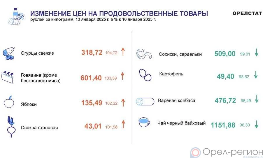 По данным Орёлстата, с 10 по 13 января в регионе выросли цены на огурцы свежие на 4,7% (средняя цена составила (318,72 руб. за кг), говядину (кроме бескостного мяса) на 3,5% (601,40 руб. за кг), яблоки на 2,2% (135,49 руб. за кг), свёклу столовую на 2% (43,01 руб. за кг).