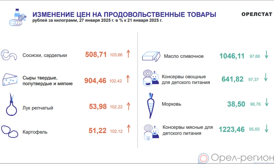 По данным Орёлстата, с 21 по 27 января в регионе выросли цены на сосиски, сардельки на 3,7% (средняя цена составила 508,71 руб. за кг), сыры твёрдые, полутвёрдые и мягкие на 2,4% (904,46 руб. за кг), лук репчатый на 2,2% (53,98 руб. за кг.), картофель на 2,1% (51,22 руб. за кг).