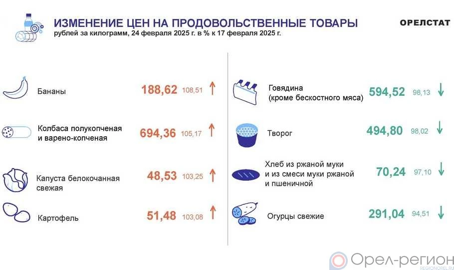 По данным Орёлстата, в регионе с 18 по 24 февраля выросли цены на бананы на 8,5% (188,62 руб. за кг), на колбасу полукопчёную и варёно-копчёную на 5,2% (694,36 руб. за кг), на капусту белокочанную свежую на 3,3% (48,53 руб. за кг), картофель на 3,1% (51,48 руб. за кг).