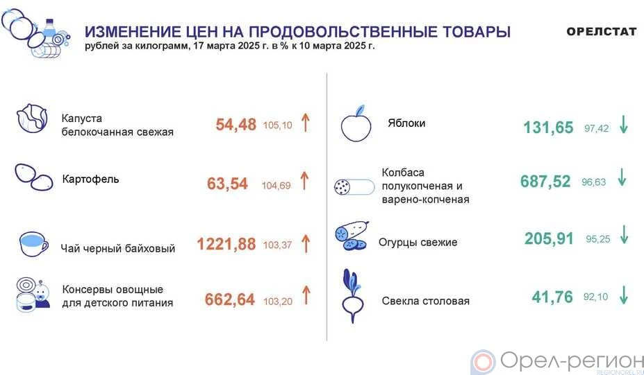 По данным Орёлстата, в регионе с 11 по 17 марта выросли цены на капусту белокочанную свежую на 5,1% (54,48 руб. за кг), картофель на 4,7% (63,54 руб. за кг), чай чёрный байховый на 3,4% (1221,88 руб. за кг), консервы овощные для детского питания на 3,2% (662,64 руб. за кг).