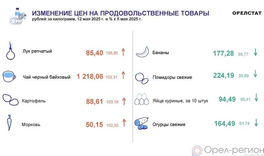 По данным Орёлстата, в регионе с 6 по 12 мая выросли на цены лук репчатый на 6,9% (средняя цена составила (85,40 руб. за кг), чай чёрный байховый на 3,3% (1 218,06 руб. за кг), картофель на 3,2% (88,61 руб. за кг), морковь на 2,4% (50,15 руб. за кг).