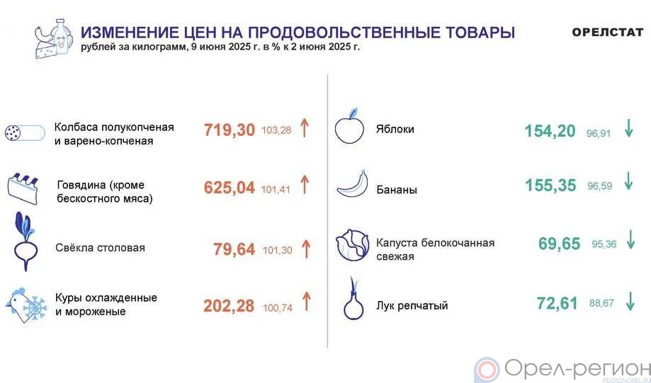 По данным Орёлстата, в регионе с 3 по 9 июня выросли цены на колбасу полукопчёную и варёно-копчёную на 3,3% (средняя цена составила 719,30 руб. за кг), говядину (кроме бескостного мяса) на 1,4% (625,04 руб. за кг), свёклу столовую на 1,3% (79,64 руб. за кг), мясо кур охлаждённых и мороженых на 0,7% (202,28 руб. за кг).