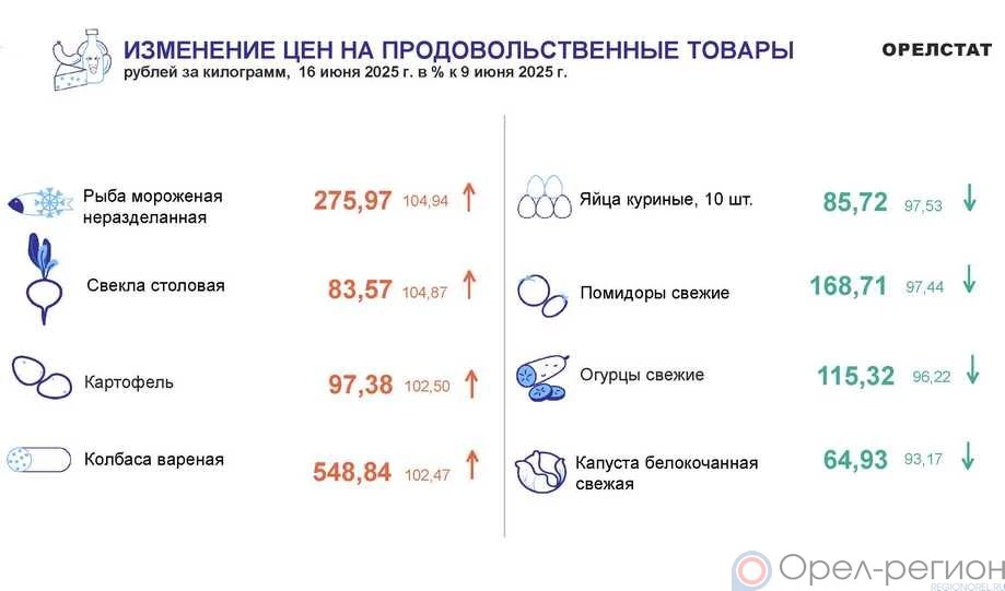 По данным Орёлстата, в регионе с 10 по 16 июня выросли цены на рыбу мороженую неразделанную на 4,9% (средняя цена составила 275,97 руб. за кг), свёклу столовую на 4,9% (83,57 руб. за кг), картофель на 2,5% (97,38 руб. за кг), колбасу варёную на 2,5% (548,84 руб. за кг).