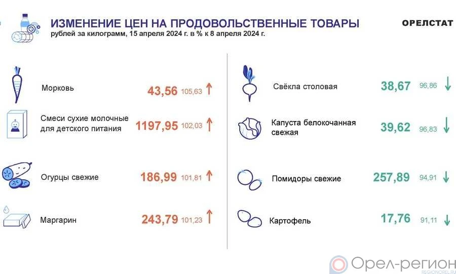 По данным Орёлстата с 9 по 15 апреля в регионе выросли цены на морковь на 5,6% (средняя цена составила 43,56 руб. за кг), смеси сухие молочные для детского питания на 2% (1197,95 руб. за кг), огурцы свежие на 1,8% (186,99 руб. за кг), маргарин на 1,2% (243,79 руб. за кг).