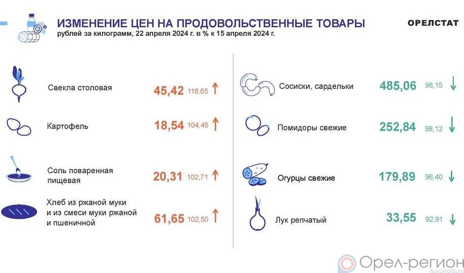 По данным Орёлстата с 16 по 22 апреля в регионе выросли цены на свёклу столовую на 18,7% (средняя цена составила 45,42 руб. за кг), картофель на 4,5% (18,54 руб. за кг), соль поваренную пищевую на 2,7% (20,31 руб. за кг), хлеб из ржаной муки и из смеси муки ржаной и пшеничной на 2,5% (61,65 руб. за кг).