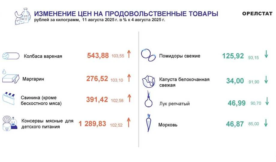 По данным Орёлстата, в регионе с 5 по 11 августа выросли цены на колбасу варёную на 3,6 % (средняя цена составила 543,88 руб. за кг), маргарин на 3,1 % (276,52 руб. за кг), свинину (кроме бескостного мяса) на 2,6 % (391,42 руб. за кг), консервы мясные для детского питания на 2,5 % (1289,83 руб. за кг), яблоки на 2,2 % (169,90 руб. за кг).