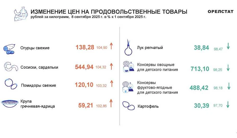 По данным Орёлстата, в регионе с 2 по 8 сентября выросли цены на огурцы свежие на 4,9 % (средняя цена составила 138,28 руб. за кг), сосиски, сардельки на 4,3 % (544,94 руб. за кг), помидоры свежие на 3,3 % (120,10 руб. за кг), крупа гречневая-ядрица на 2,9 % (59,21 руб. за кг).