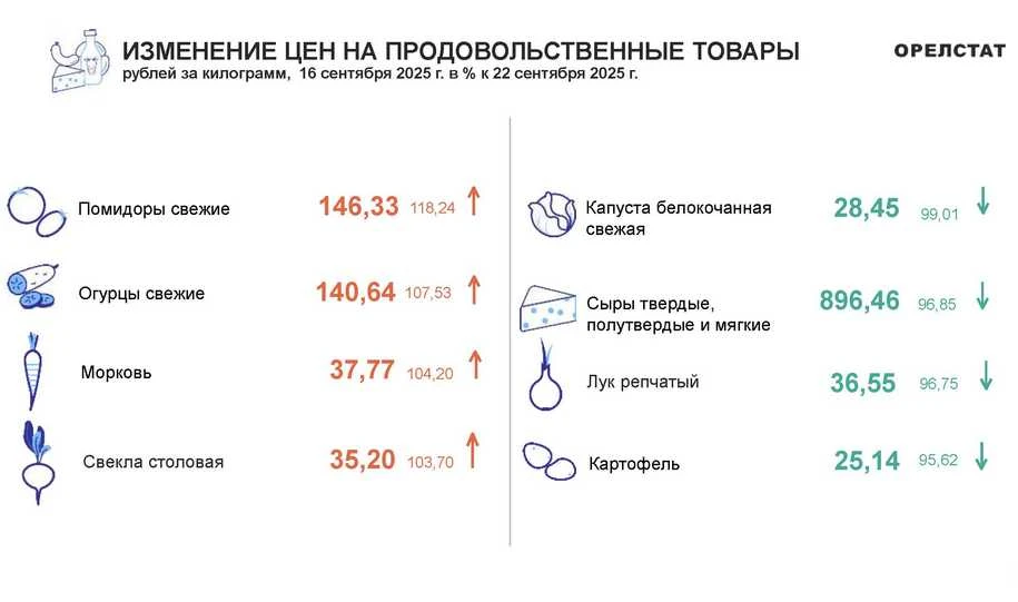 По данным Орёлстата, в регионе с 16 по 22 сентября выросли цены на помидоры свежие на 18,2 % (средняя цена составила 146,33 руб. за кг), огурцы свежие на 7,5 % (140,64 руб. за кг), морковь на 4,2 % (37,77 руб. за кг), свёклу столовую на 3,7 % (35,20 руб. за кг).