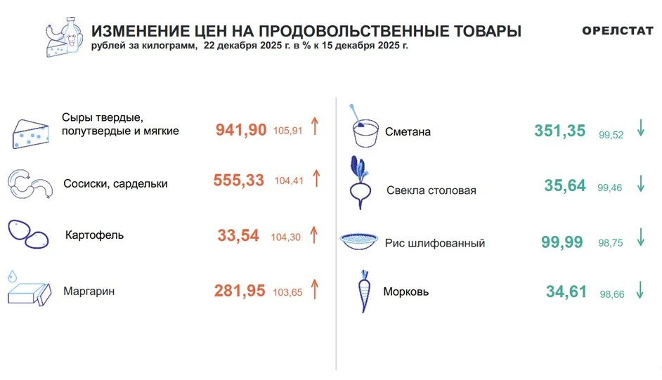 По данным Орёлстата, в регионе с 16 по 22 декабря выросли цены на сыры твёрдые, полутвёрдые и мягкие на 5,9 % (средняя цена составила 941,90 руб. за кг), сосиски, сардельки на 4,4 % (555,33 руб. за кг), картофель на 4,3 % (33,54 руб. за кг), маргарин на 3,7 % (281,95 руб. за кг).