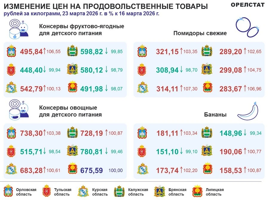 По данным Орёлстата, в регионе с 17 по 23 марта выросли цены на консервы фруктово-ягодные для детского питания на 6,6 % (средняя цена составила 495,84 руб. за кг), консервы овощные для детского питания на 3,4 % (738,30 руб. за кг), помидоры свежие на 3,4 % (321,15 руб. за кг), бананы на 3,3 % (181,11 руб. за кг).