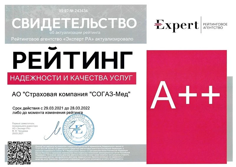 Рейтинговое агентство «Эксперт РА» подтвердило рейтинг страховой медицинской организации «СОГАЗ-Мед» на уровне А++ – это наивысший по применяемой шкале уровень надежности и качества услуг в рамках программы ОМС (прогноз по рейтингу стабильный).