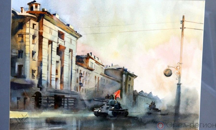 Порадовала своим неувядающим талантом и Жанна Травинская. Её трогательные картины «Молитва матери», «Тёркин на войне» и «Выпьем за Победу» объединены в триптих, наполненный и улыбкой, и светлой радостью со слезами на глазах. Той радостью, которой наполнена и акварель молодого художника Валерия Лукьянчикова «Орёл наш. 5 августа 1943 г.»