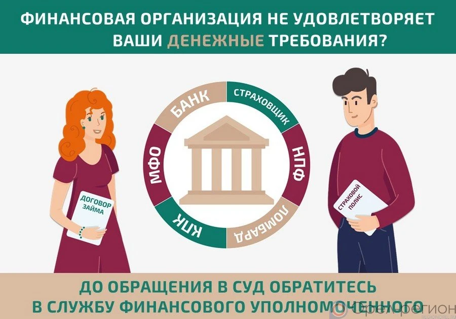 При помощи финансового уполномоченного вы можете решить имущественный (денежный) спор со страховой компанией, банком, микрофинансовой организацией, негосударственным пенсионным фондом, ломбардом и кредитным потребительским кооперативом.