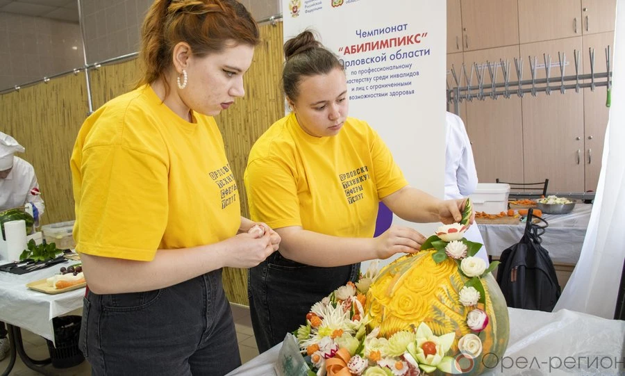 В соревнованиях по компетенции «Карвинг», прошедших в Орловском техникуме сферы услуг, приняли участие пятеро конкурсантов - Дарья Годишевская, Виктория Леонова, Виктория Полякова, Максим Грибанов и Альбина Яньшина. Студентам нужно было за два часа составить композицию из красиво вырезанных фруктов и овощей.