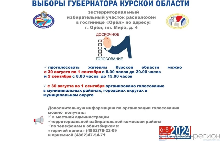 Проголосовать жителям Курской области на указанном избирательном участке можно с 30 августа по 1 сентября с 8.00 до 20.00 и 2 сентября с 8.00 до 15.00.