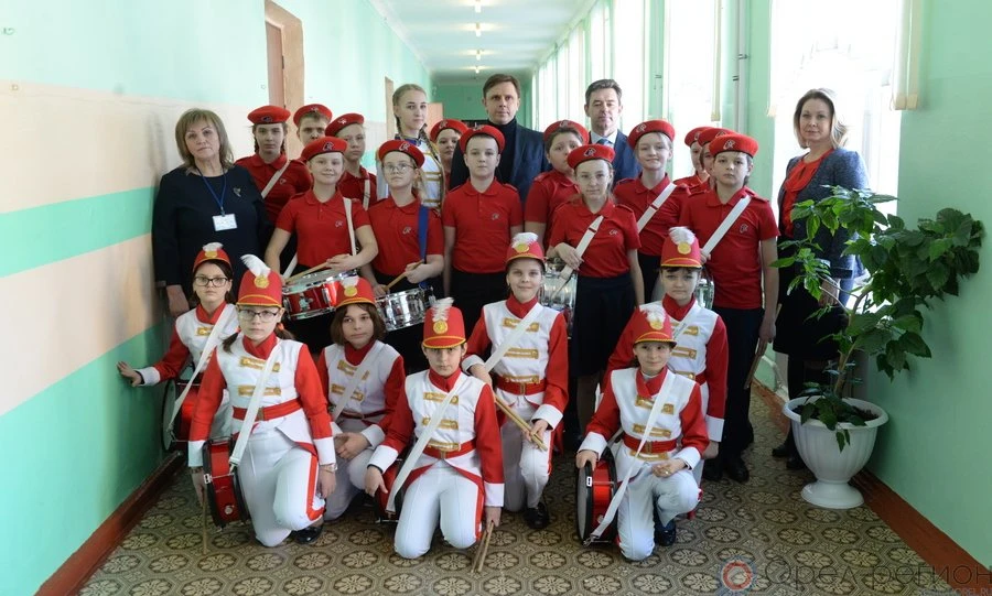 Визитной карточкой школы являются отряд юных барабанщиц и отряд юнармии им. А. Г. Шипунова. Ребята продемонстрировали гостям виртуозную игру на барабанах, а также показали им школьный музей.