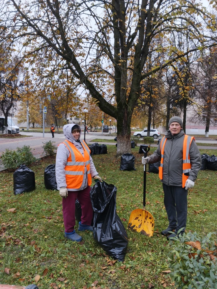 Очень слаженно работают люди в оранжевых жилетах. В эту осень дожди не дали просохнуть упавшей листве, а сгребать мокрые листья — это уже труд потяжелее будет. Все газоны в мешках, каждый из которых — результат и свидетельство простого, но такого всем нам необходимого труда. Чтобы было чисто, чтобы было красиво.