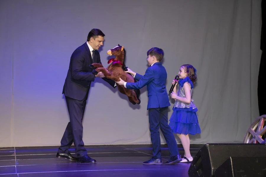 В ответ на поздравления дети подарили губернатору символ наступающего Нового года — большую игрушечную лошадку, которую он в свою очередь по сложившейся традиции вручил одному из малышей.