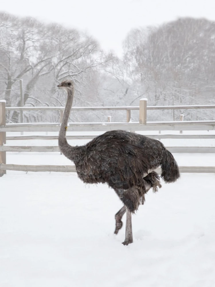 Для страусов в хозяйстве Вечеринских сделали специальный вольер и огороженный загон длиной 70 метров — эта птица обязательно и ежедневно должна двигаться, бегать, что, кстати, делает с удовольствием. Снег «африканца» не пугает, но на морозе ему долго быть нежелательно.