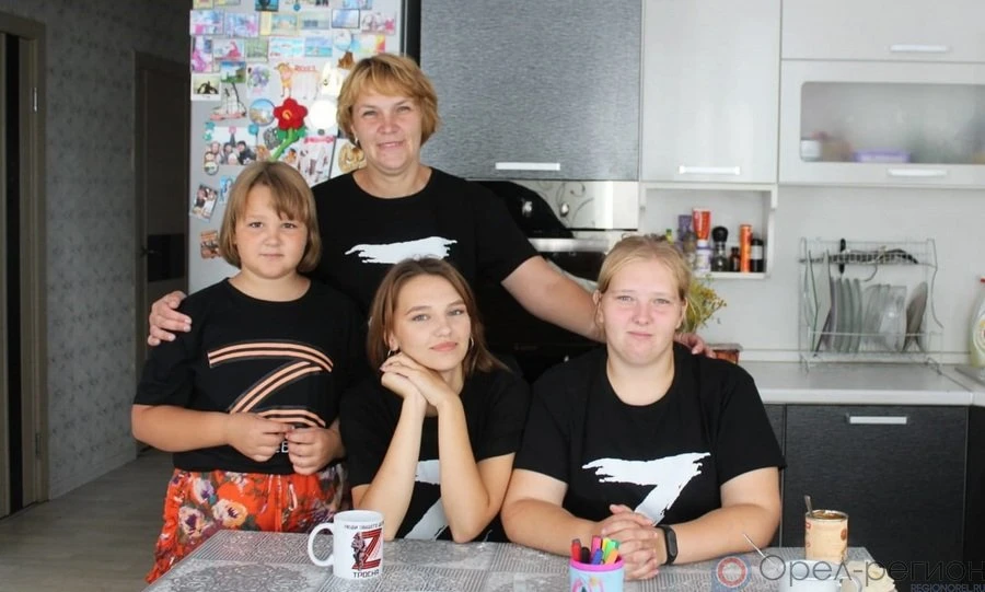 Рядом с Евгенией три дочери - девятнадцатилетняя Ольга, семнадцатилетняя Олеся и восьмилетняя Полина. Все одеты в футболки с символикой «Z».