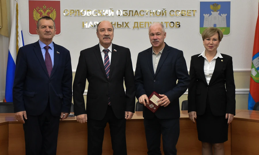 Почётный знак Олегу Владимировичу вручили первые лица областного заксобрания — председатель Орловского областного Совета народных депутатов Леонид Музалевский и его первый заместитель Михаил Вдовин.