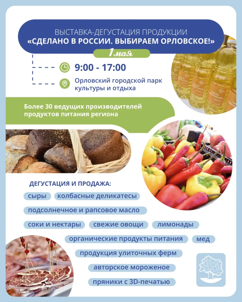 1 мая в городском парке весь день будет работать выставка-дегустация «Сделано в России. Выбираем орловское!». (0+)
