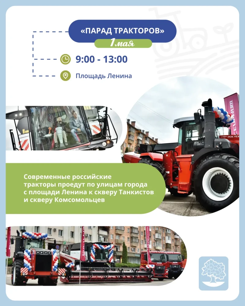 Также впервые в нашем городе пройдёт парад тракторов: современная техника отечественного производства организованно проедет от площади Ленина по центральным улицам Орла.
