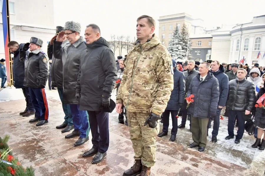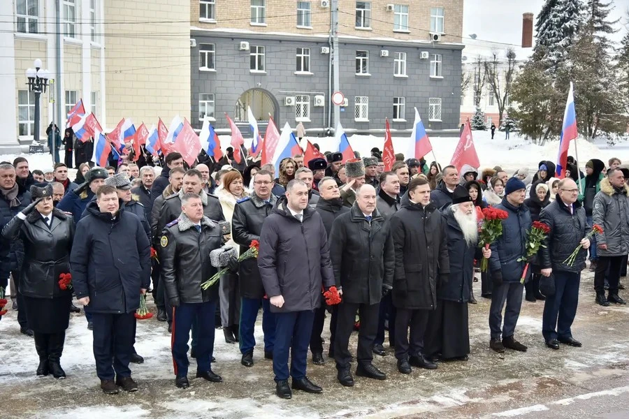 Губернатор Орловской области Андрей Клычков принял участие в митинге по случаю предстоящего Дня защитника Отечества и вместе с орловцами возложил гирлянду к стеле.