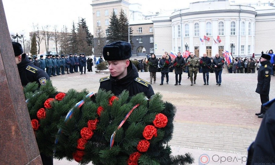 Гирлянду Славы и цветы к стеле возложили губернатор Андрей Клычков, председатель Орловского областного Совета народных депутатов Леонид Музалевский, cенатор РФ Василий Иконников, депутат Государственной думы ФС РФ Ольга Пилипенко, главный федеральный инспектор по Орловской области Эдуард Голованёв, мэр Орла Юрий Парахин, председатель Орловского городского Совета народных депутатов Василий Новиков, митрополит Орловский и Болховский Тихон.