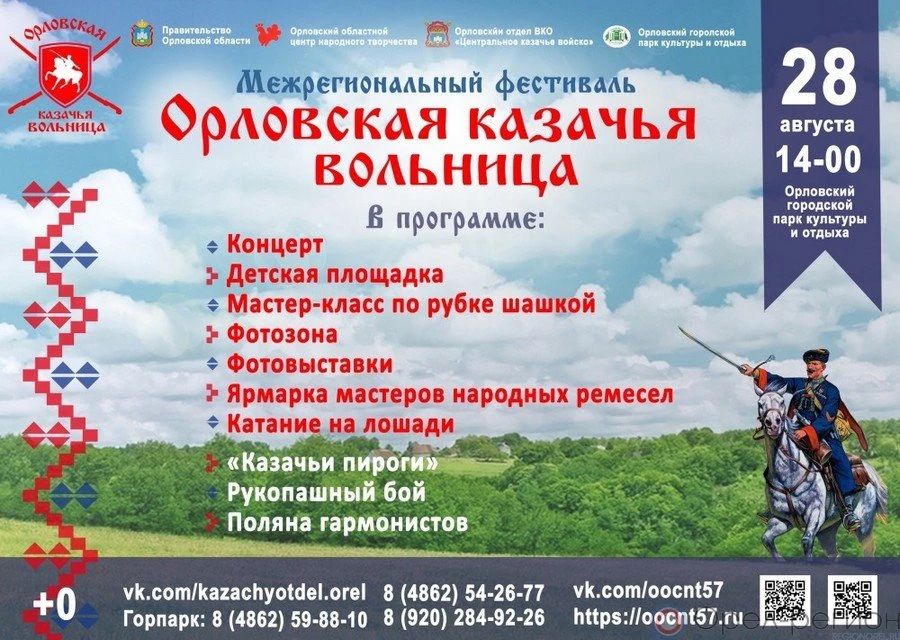 Организаторами фестиваля являются департамент внутренней политики и развития местного самоуправления администрации Орловской области, Центр патриотического воспитания «Патриот 57», ООКОВК «Центральное казачье войско», Орловский областной центр народного творчества. (0+)